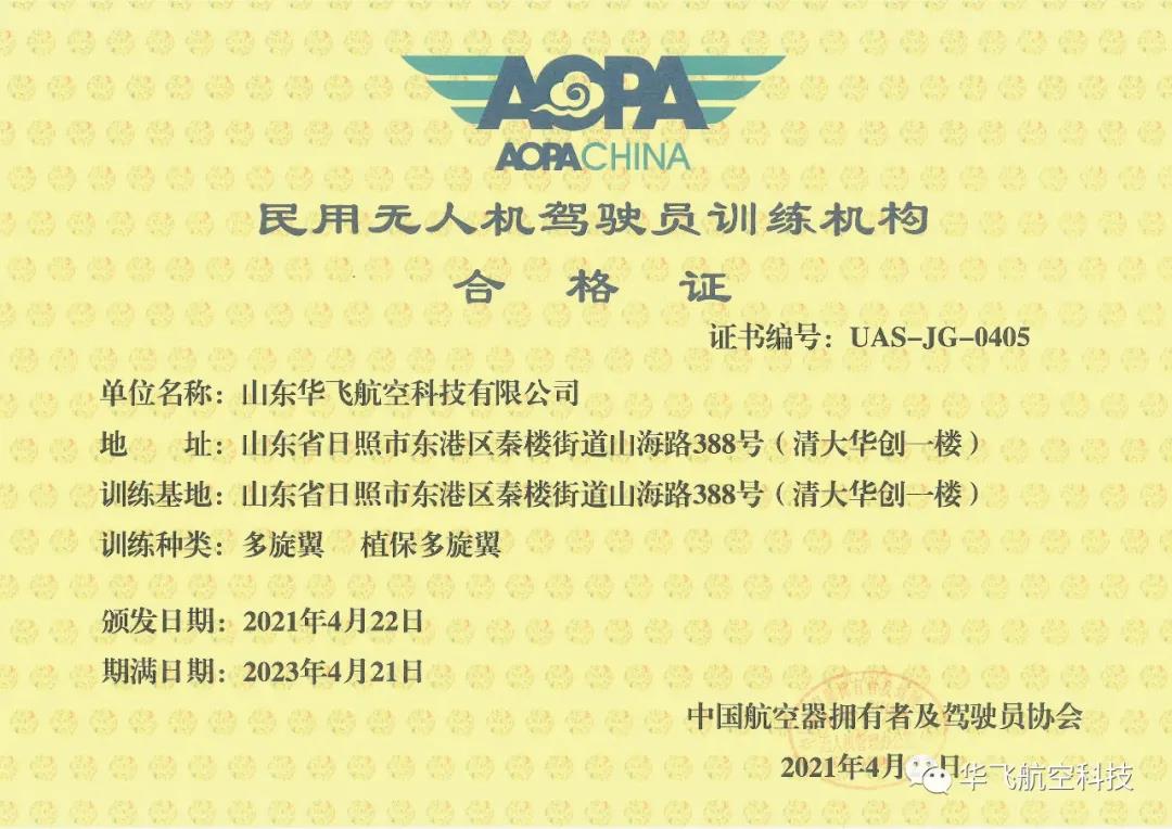 熱烈祝賀:山東華飛航空《民用無人機駕駛員訓練機構臨時合格證》轉為《民用無人機駕駛員訓練機構合格證》!